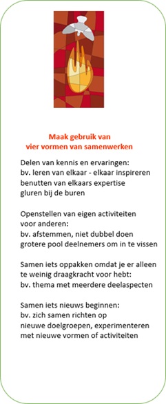 Algemeen: uitwerken van taken waar de ene kerk beter in is als de andere kerk, afstemmen met elkaar wat je doet en wat je belangrijk vindt.